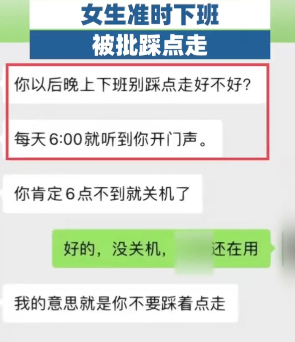 近日,江苏南京。一女生下午六点准时下班被领导批评不要踩点下班。孙女士称,自己是文员岗位,公司上午九点半上班,下午六点下班,当天自己已经做完工作,像往常一样六点下班,没想到领导就给自己发了消息,说以后不要让自己六点准时走,哪怕干完活下班后才能关电脑,自己觉得不是很理解。