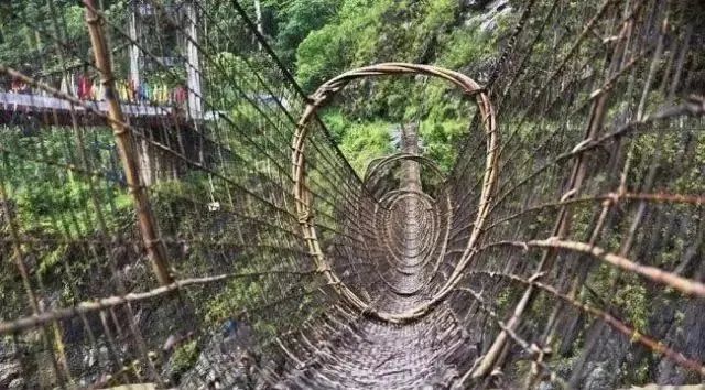 藤网桥,是墨脱特有的景观。全桥无桥墩、无木板、一个钉也找不到,用特别的白藤条编制成网筒状。