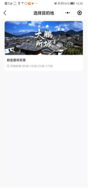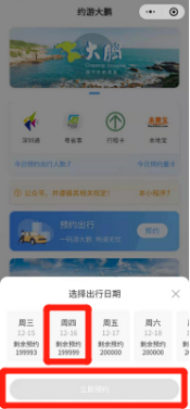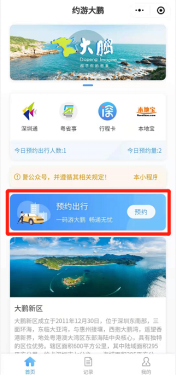 第一步:打开“约游大鹏”小程序,进入“首页”—点击“预约出行”,选择出行日期,点击“立即预约”,进入选择目的地,选择您要出行的景区。