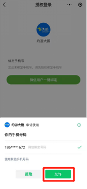 打开“约游大鹏”小程序,进入“首页”—点击“预约出行”,此处需绑定您的手机号码,点击“允许”完成登录操作。