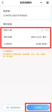 第二步:填写目的地预约信息,点击“立即预约”,预约完成。