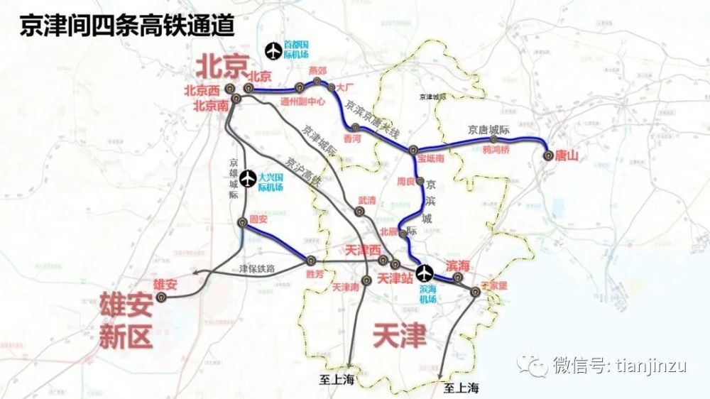 京滨城际铁路被称为京津间第二条城际,从北京站引出,沿途设宝坻南站、京津新城、北辰站、滨海机场站,终至天津市滨海新区滨海站,一期工程预计2022年开通使用。