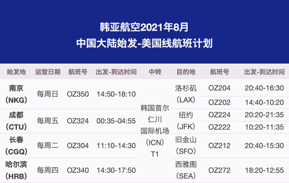 中国始发城市为南京、成都、长春、哈尔滨,经韩国转机抵达美国洛杉矶、纽约、旧金山、西雅图,更多航班信息查看下图: