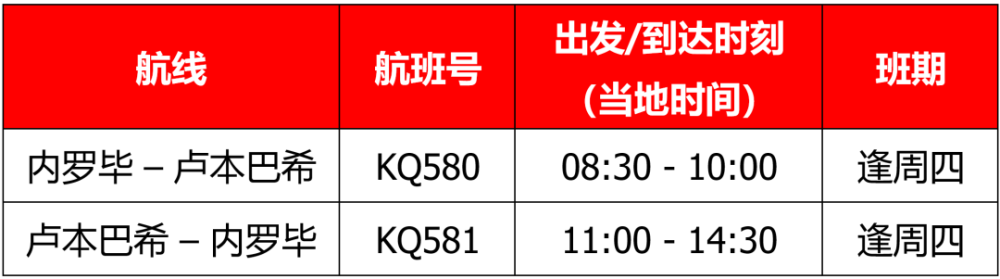 根据肯航总部计划,自2021年6月3日起,肯尼亚航空将在内罗毕往返卢本巴希航线现有班期基础上,于每周四新增一趟定期客运航班: