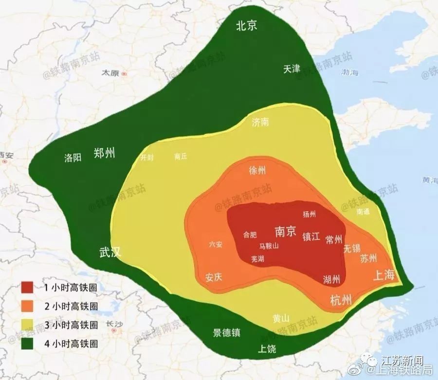 扩大一小圈,2小时左右的高铁时间,可以抵达无锡、苏州、上海、杭州、徐州、六安、安庆等城市。