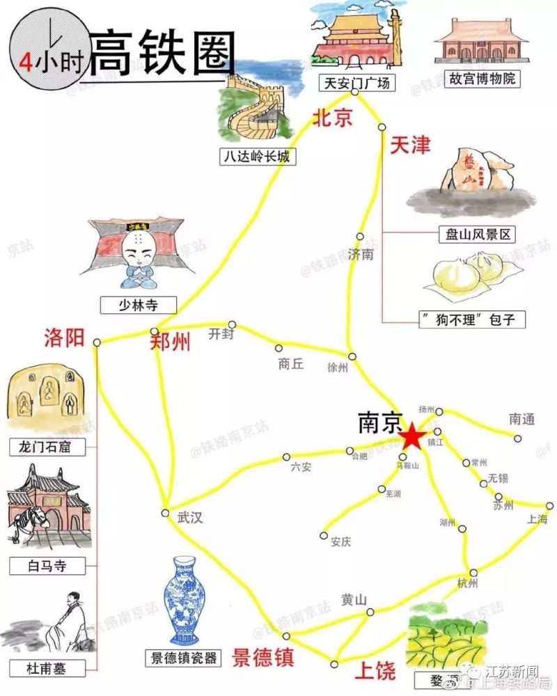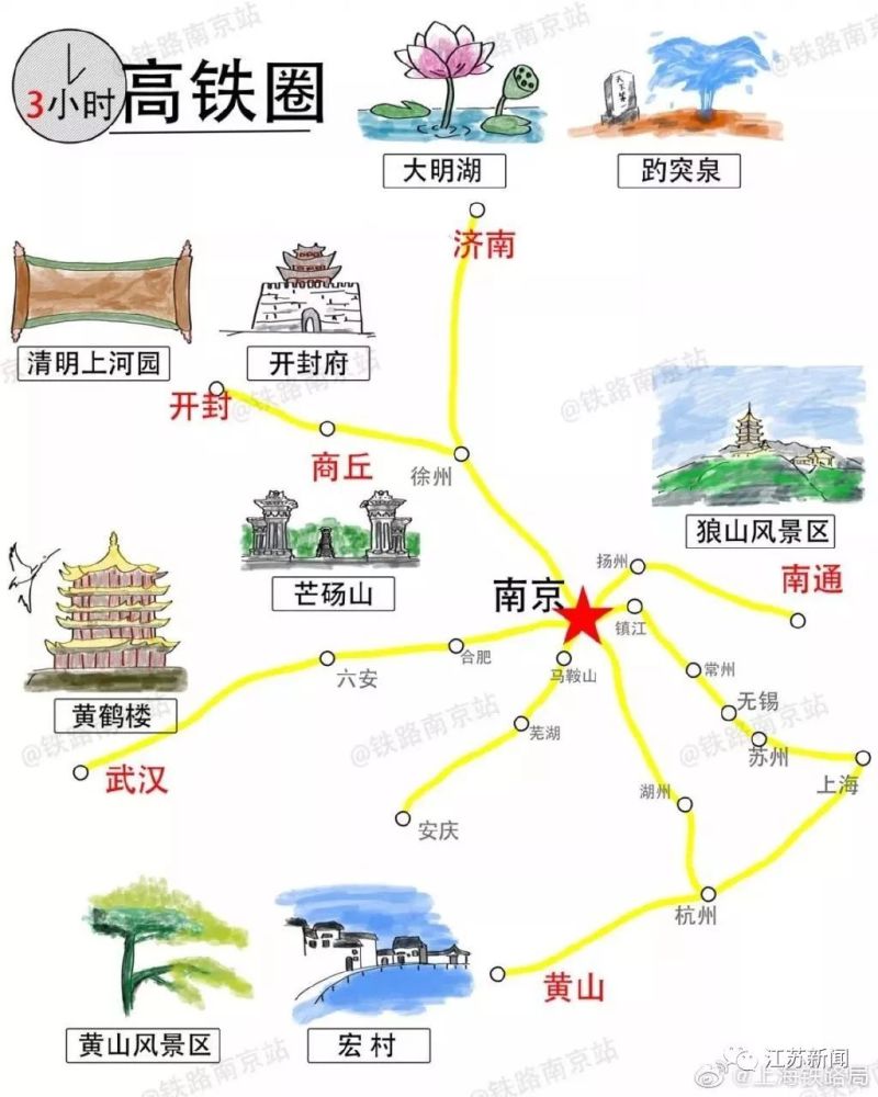 3小时高铁圈,可以抵达南通、黄山、武汉、开封、商丘、济南等城市,这都已经到山东、河南了呢,大明湖、趵突泉、开封府、黄鹤楼……过去只在教科书和电视上见过的景点,近在眼前!