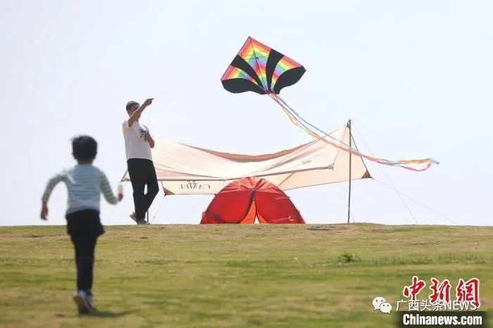 资料图:扎好帐篷,放飞风筝,体验假日生活。?泱波 摄