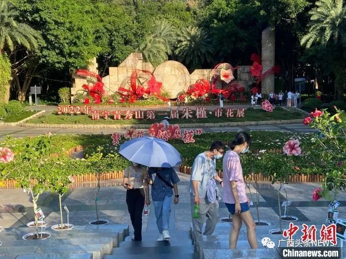 南宁青秀山从看得见的生态,摸得着的自然出发,开展植物艺术创造、户外教育训练、自然生态教育和园艺体验教育等主题的研学实践活动。图为游客参观南宁青秀山朱槿·市花展。林洁琪 摄