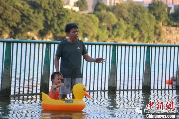 图为家长带着孩子在“百里柳江”亲水平台戏水。林馨 摄