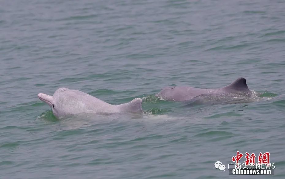 图为2022年5月下旬,一对中华白海豚出现在广西钦州三娘湾海域。赵一 摄