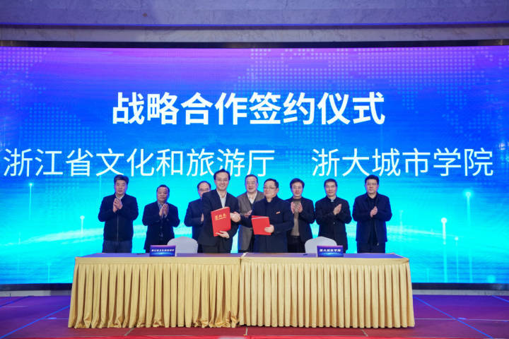 仪式上,浙江省文化和旅游厅芮宏副厅长、浙大城市学院张德平副校长分别代表双方签署了战略合作协议。后续,双方将围绕科研共创、人才培养等内容,不断增强校地合作,实现优势互补、三赢互动、共同发展。