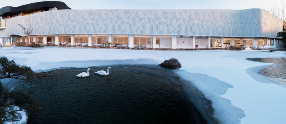 围绕着艺术馆,外有假山、松柏、水景,水里生长着两对黑天鹅。到了圣诞,如果不下雪,这里还会人工造雪以营造浪漫氛围。