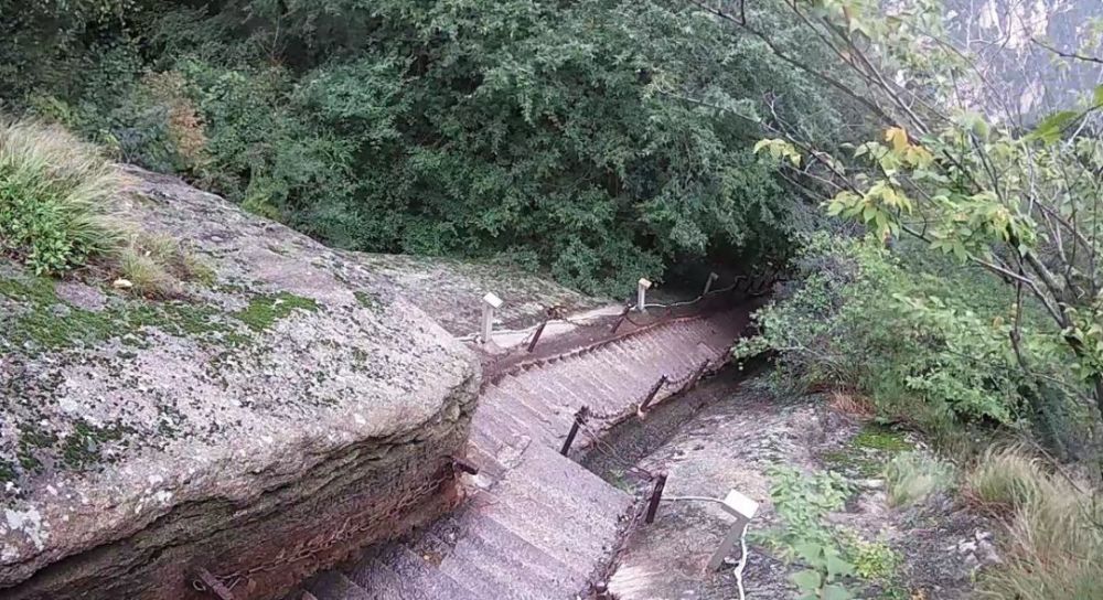 “犁险于幢,幢险而犁突”这描写的是夹在陡峭石壁之间一条深不可测的沟状险道,石阶570多阶。传说太上老君过此处,见无路可通,就牵来青牛一夜间犁成这条山沟。