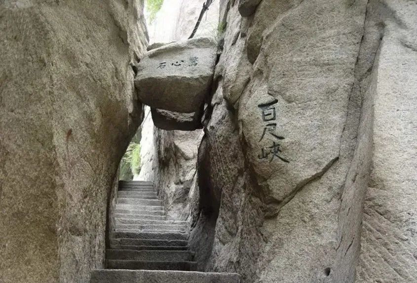 "百尺峡"也叫"百丈崖",仍是一处危石耸峙,直插云表,令人望而生畏的地方。"过千尺幢向北折即到"百尺峡",它是登华山的第二个险境。
