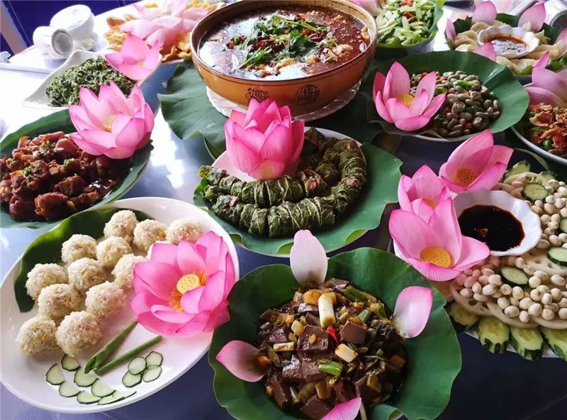荷花不仅可以观赏,也可以做成多种菜肴。来到光禄古镇,除了泛舟荡漾碧波之间赏荷花、摘莲蓬,还能品尝特色荷花宴,油炸荷花瓣、凉拌藕片、清甜莲子等美食清香解腻,值得一尝。