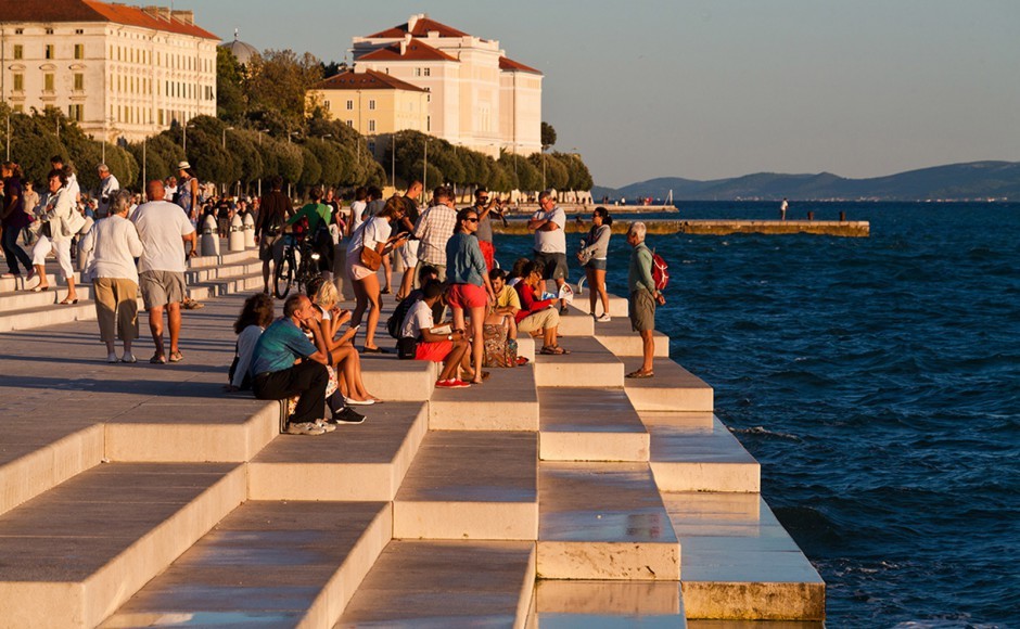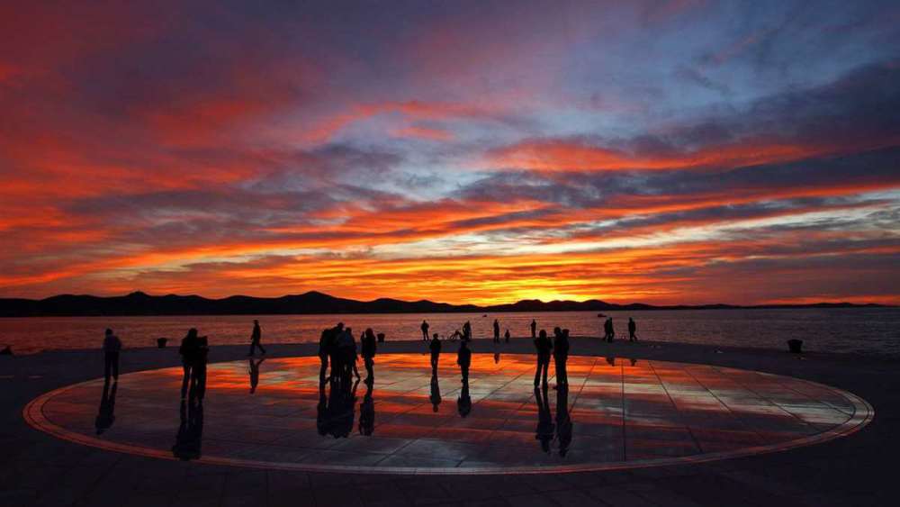 另一个特色是“向太阳致敬”(Greeting to the Sun)——由几百块太阳能光板拼成的圆形广场,白天看似彩色玻璃,入夜会将电能转换成灯光,闪烁出各种绚烂夺目的美妙图案。著名电影大师希区柯克(Alfred Hichcock)曾说过:“札达尔拥有世界上最美丽的落日。”此话真的不假。