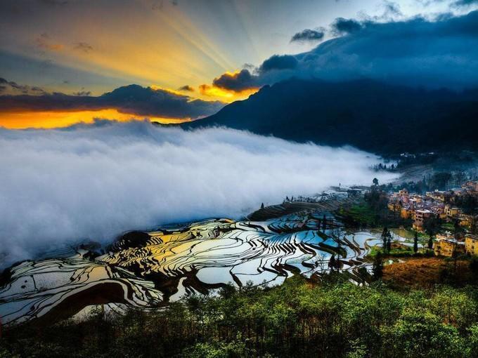 元阳梯田的日出日落,那壮观的场面、那磅礴的气势、那斑斓的色彩、那浓郁的气息、那流动的线条就是一幅波澜壮阔、令人震撼的油彩画!