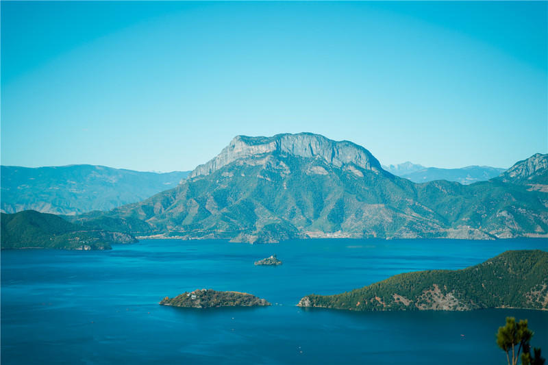 湛蓝的湖水被群山围绕,透明的湖面就像一块画板,绘出天空的澄澈,白云的多姿,远山的绵延,写意般的唯美。