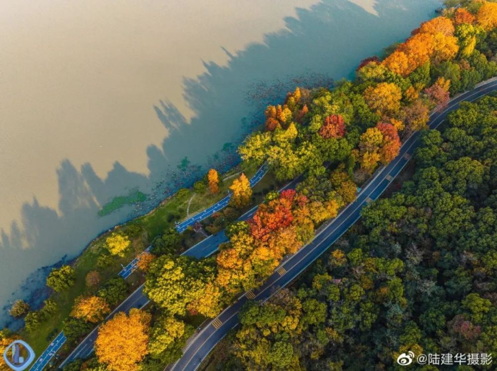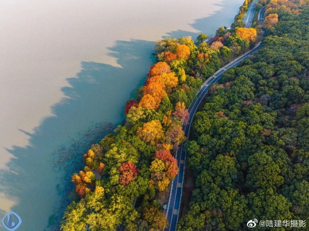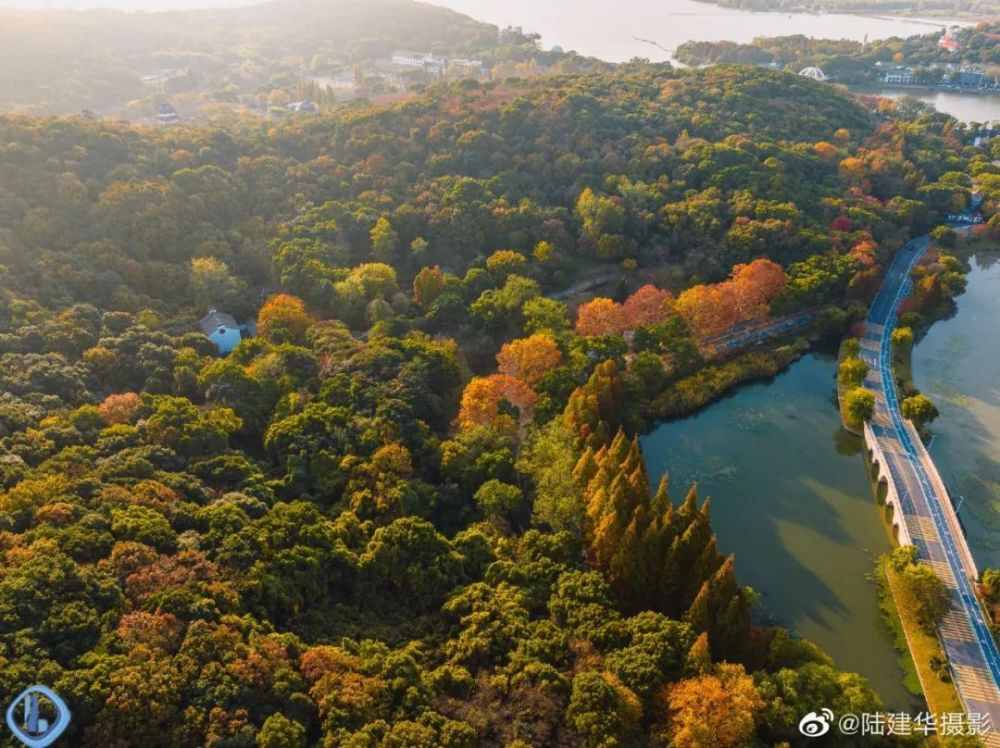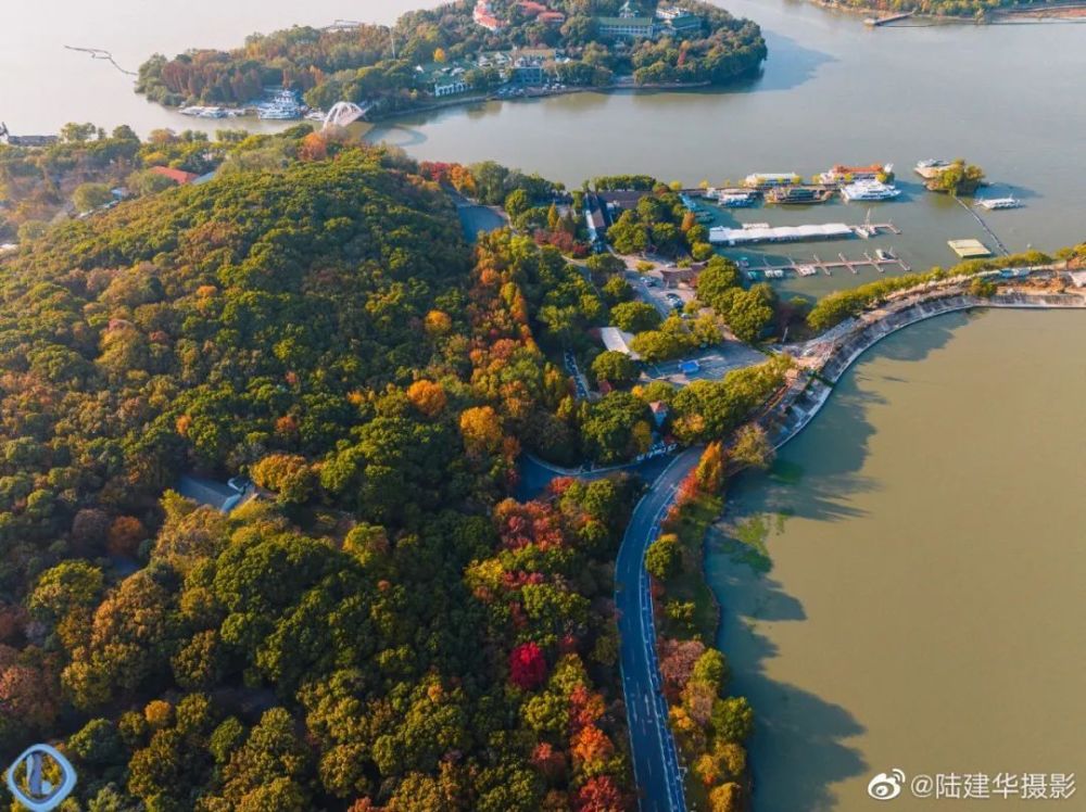 从空中俯视“十里芳径”,犹如一条镶嵌着金黄色的“绸带”,围着鼋头渚的山水起舞。