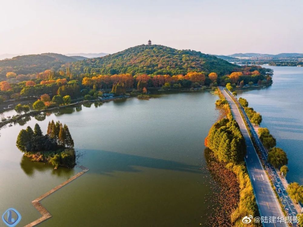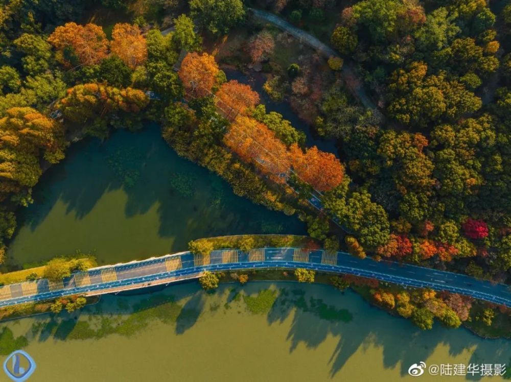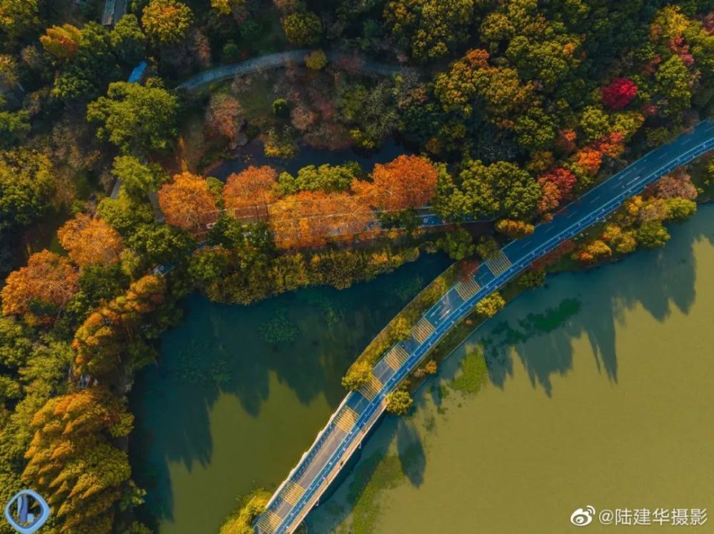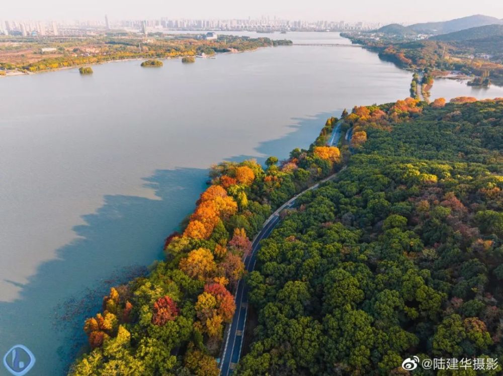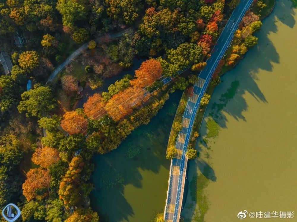 从空中俯视“十里芳径”,犹如一条镶嵌着金黄色的“绸带”,围着鼋头渚的山水起舞。