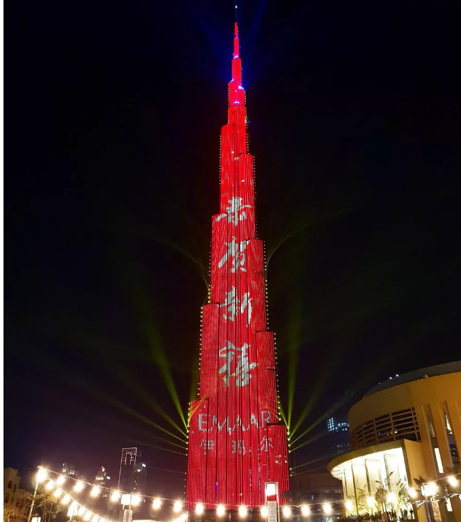 春节时,迪拜的地标建筑——哈利法塔和帆船酒店都会举行春节主题的灯光秀,大红的背景上,映着中文写的新年贺词,闪耀着浓浓的中国年味。