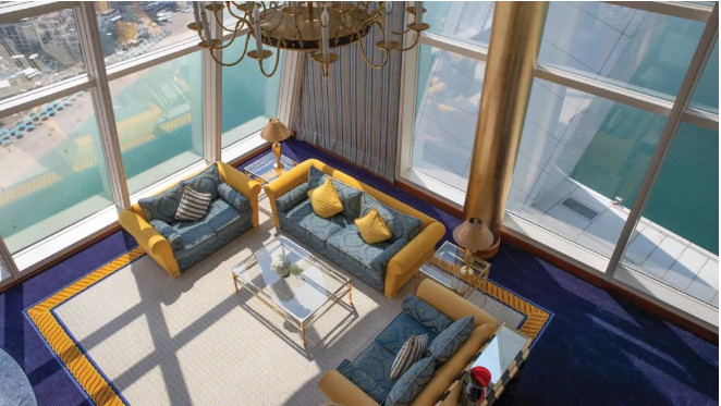 迪拜地标帆船酒店,是世界上第一家7星级酒店,最小的房间面积为170平米,最大的套房面积是780平米,比你家住起来还舒心。