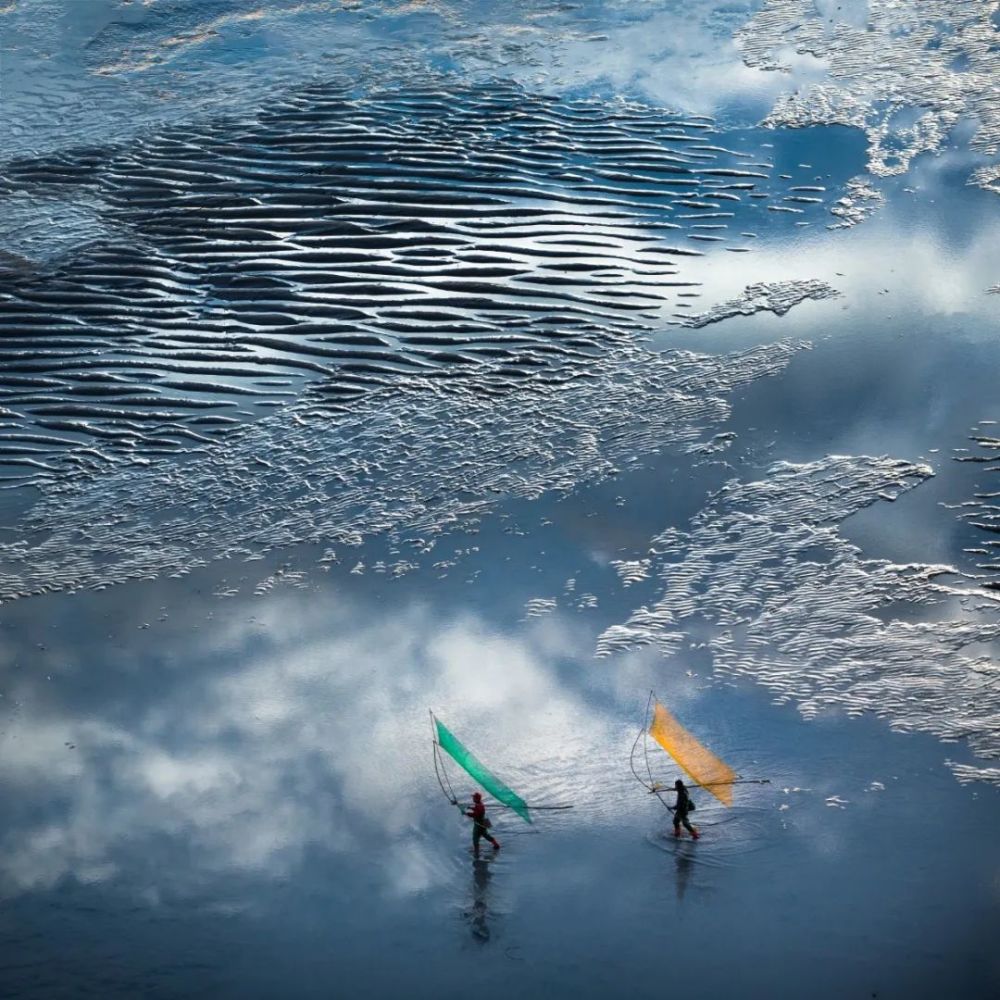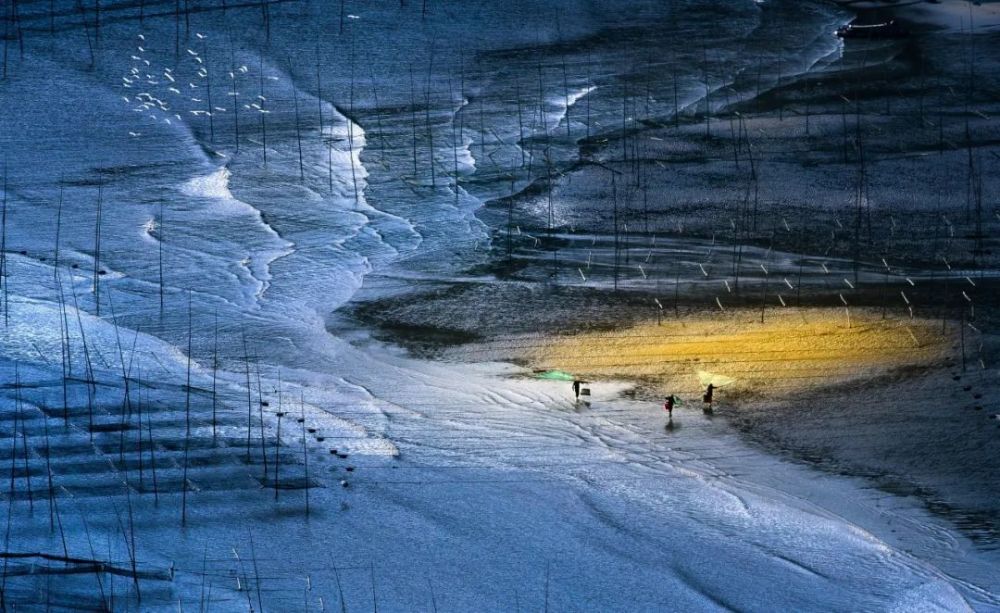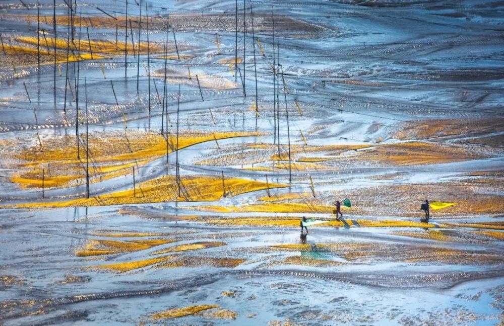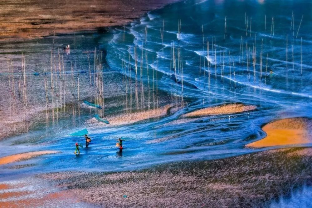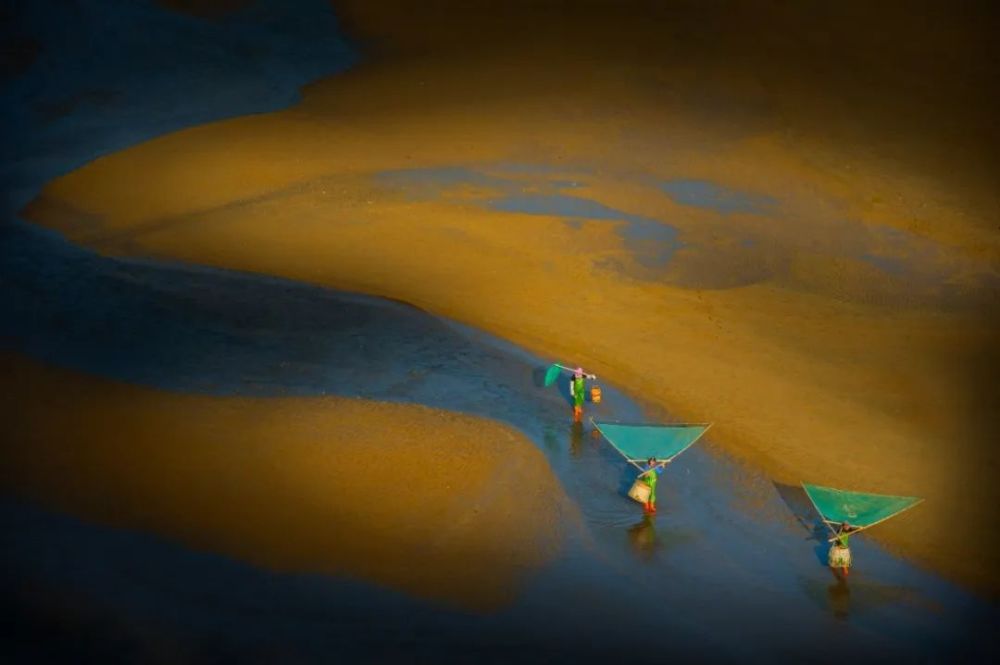 16:30到达西山,黄昏顺光拍摄金黄色沙滩与青蓝色水沟交错形成的梦幻滩涂及滩涂之上随光而变的桅竿影,搭配着渔夫劳作穿梭的身影构成一幅美妙无比的滩涂画卷。