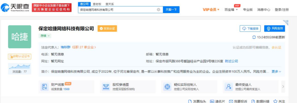 天眼查App显示,7月25日,保定哈捷网络科技有限公司成立,法定代表人为褚轶群,注册资本100万元人民币,经验范围包括共享自行车服务;小微型客车租赁经营服务;软件开发;网络与信息安全软件开发;机械设备研发等。该公司由哈啰出行关联公司上海钧正网络科技有限公司全资控股。