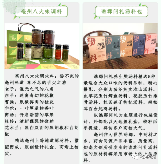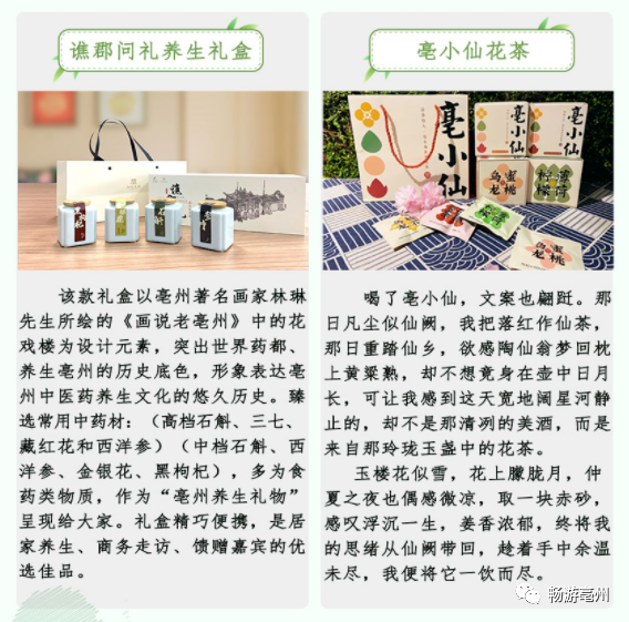 围绕“亳州养生”公共品牌打造和推广,依托本市特有的道家文化、中医药养生文化、曹魏文化等资源,深度开发千古一亳系列、花戏楼系列、芍花系列、华佗系列、三曹系列、亳文化系列、锦绣亳景系列等文化衍生品和旅游纪念品200余个品类。赋予商品亳州文化内涵,功能属性涵盖日常吃穿用度各个方面,广受游客好评。