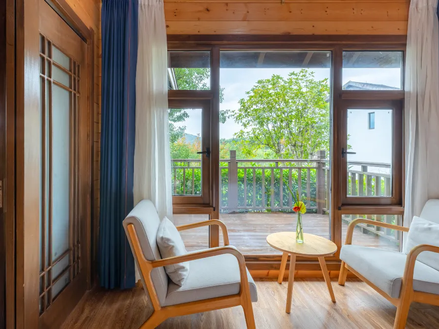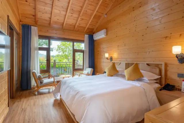 明亮的落地窗视野极好,可一览郁葱的山林美景!木屋以黄色风格为基调,沉浸式感受大自然的馈赠。床上用品质感细腻,给您带来难忘的睡眠体验!