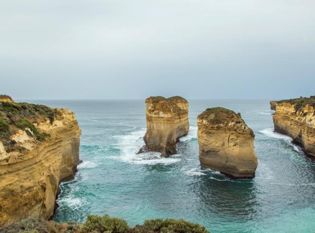 伦敦断桥,伦敦断桥位于大洋路的坎贝尔港,是一处自然之力作用形成的漂亮海岸景观,从前这个岩石是突出海面与陆地连接的岬,由于海浪的侵蚀冲刷形成2个圆洞,正好成双拱形,所以起名为“伦敦桥”。在1990年1月15日的傍晚时分,与陆地连接的圆洞轰然塌落,与大陆脱离形成现在看到的断桥的样子。于是现在人们叫它为“伦敦断桥。
