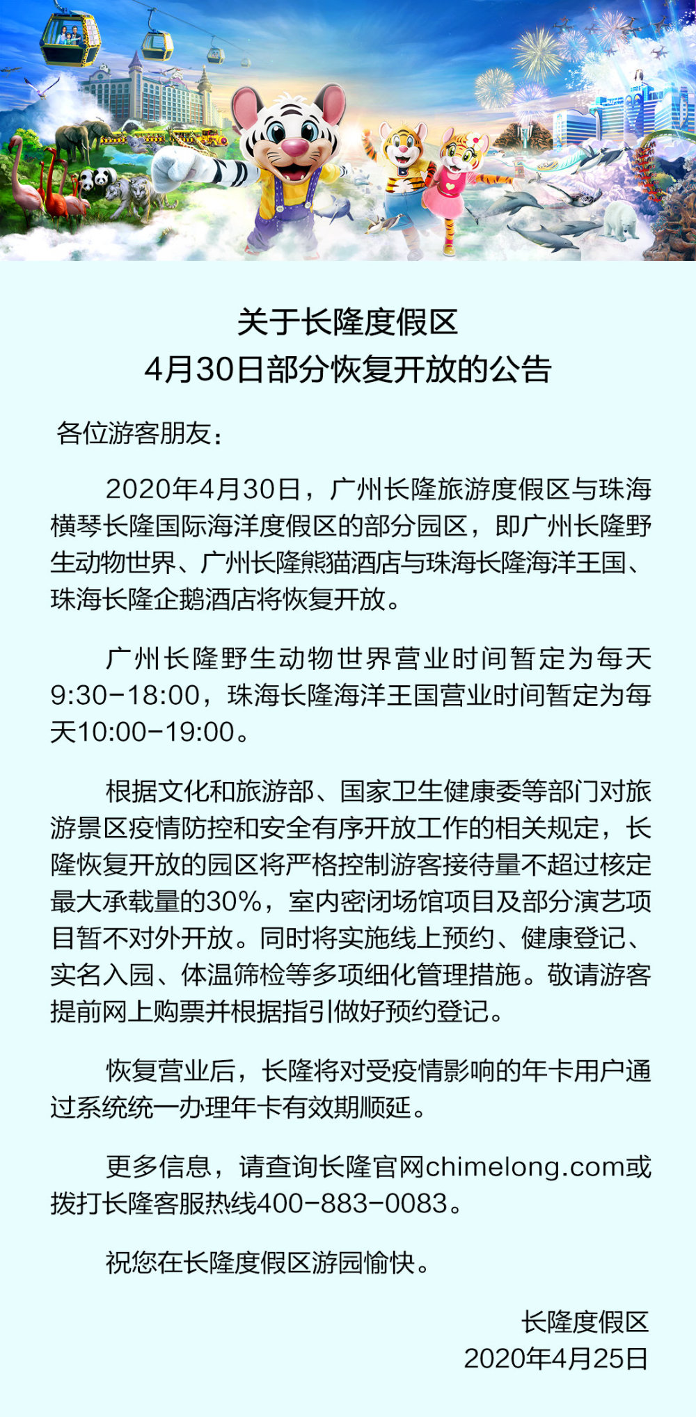 根据“广州长隆”官方微博,4月30日,广州长隆旅游度假区与珠海横琴长隆国际海洋度假区的部分园区,即广州长隆野生动物世界、广州长隆熊猫酒店与珠海长隆海洋王国、珠海长隆企鹅酒店将恢复开放。