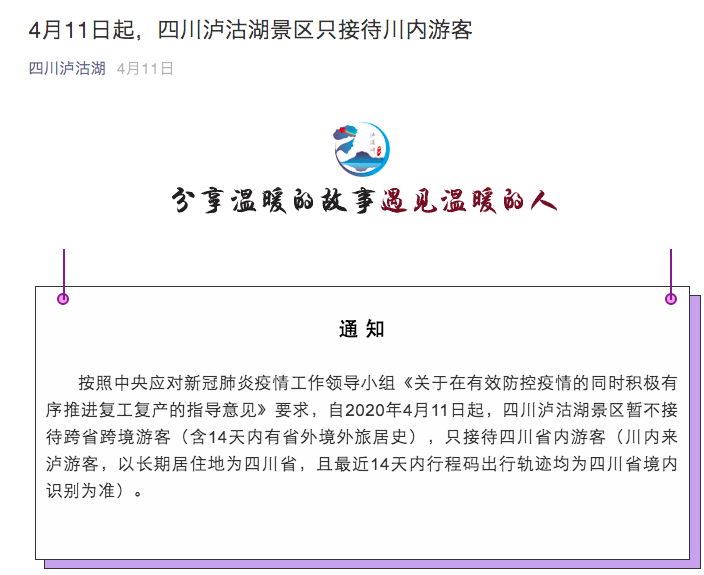 根据“四川泸沽湖”微信公众号此前发布的通知,4月11日起,四川泸沽湖景区暂不接待跨省跨境游客(含14天内有省外境外旅居史),只接待四川省内游客(川内来泸游客,以长期居住地为四川省,且最近14天内行程码出行轨迹均为四川省境内识别为准)。