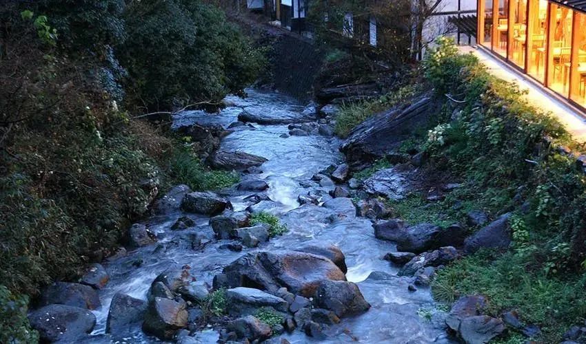 同样位于青山中,需要走一段山路才能抵达,更加增添了这座旅馆的神秘气息。大门掩映在一片翠绿中,很容易就错过呢。明神馆特别会利用山间的自然资源,在馆内能听得到流淌着的溪流的声音。