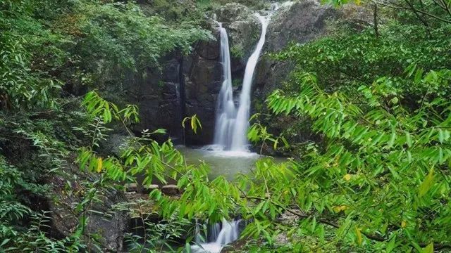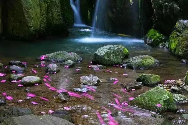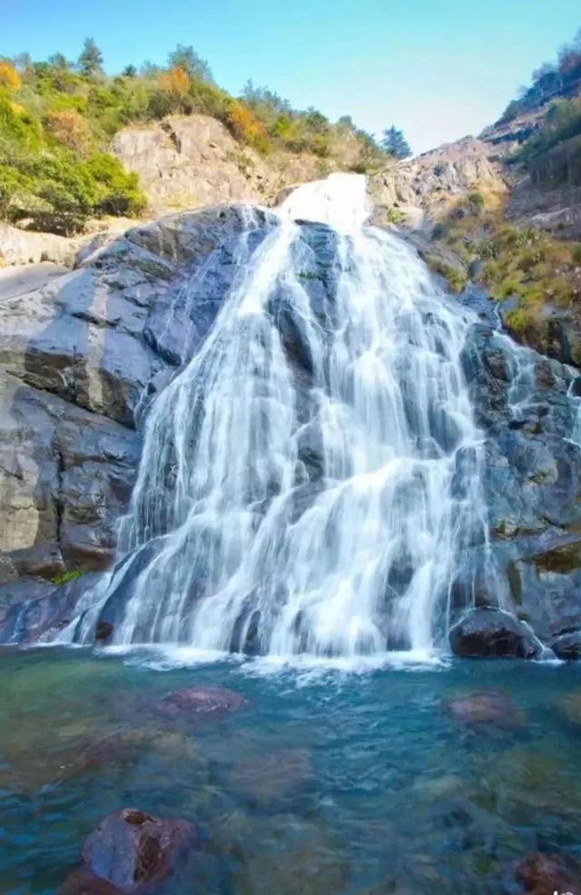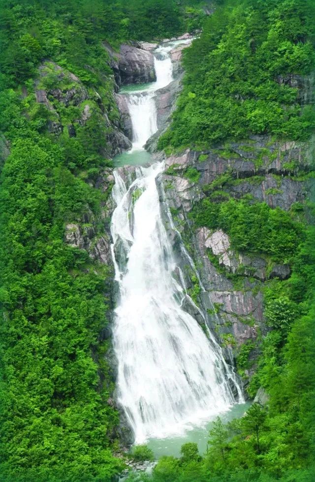 百杖三叠瀑为国内罕见的冰臼瀑布,堪称江南一绝。
