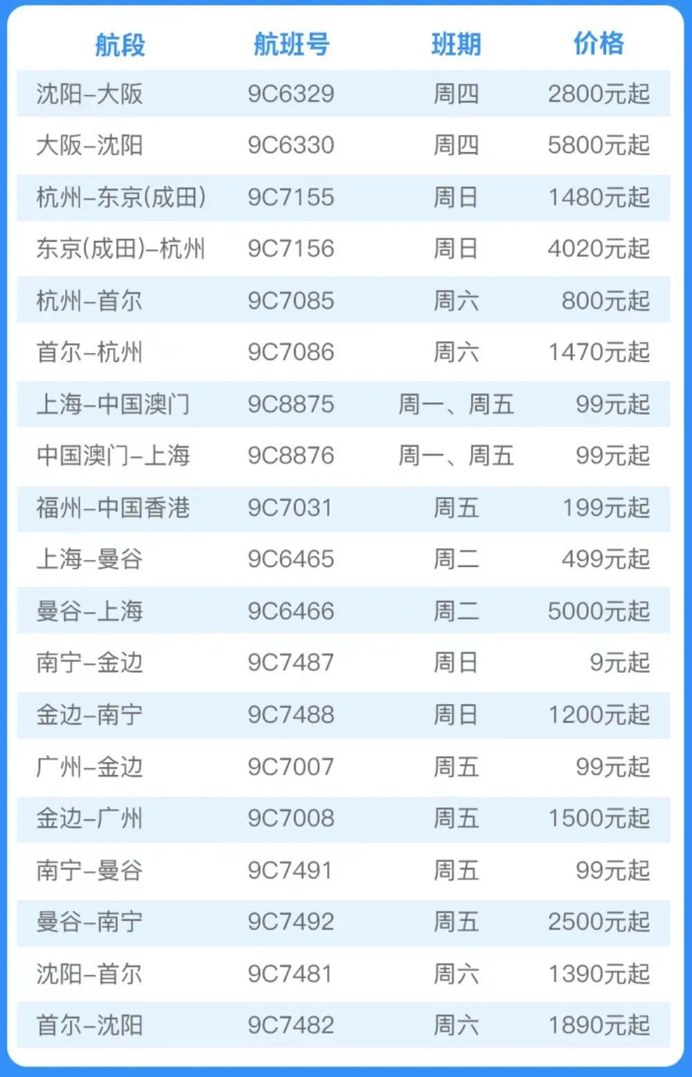 春秋航空方面,10 月 14 日起恢复或开通多条港澳、国际航线。国际航线方面包括沈阳-大阪、杭州-东京(成田)、杭州-首尔、上海-曼谷、南宁-金边、广州-金边、南宁-曼谷、沈阳-首尔等 8 条往返航线。