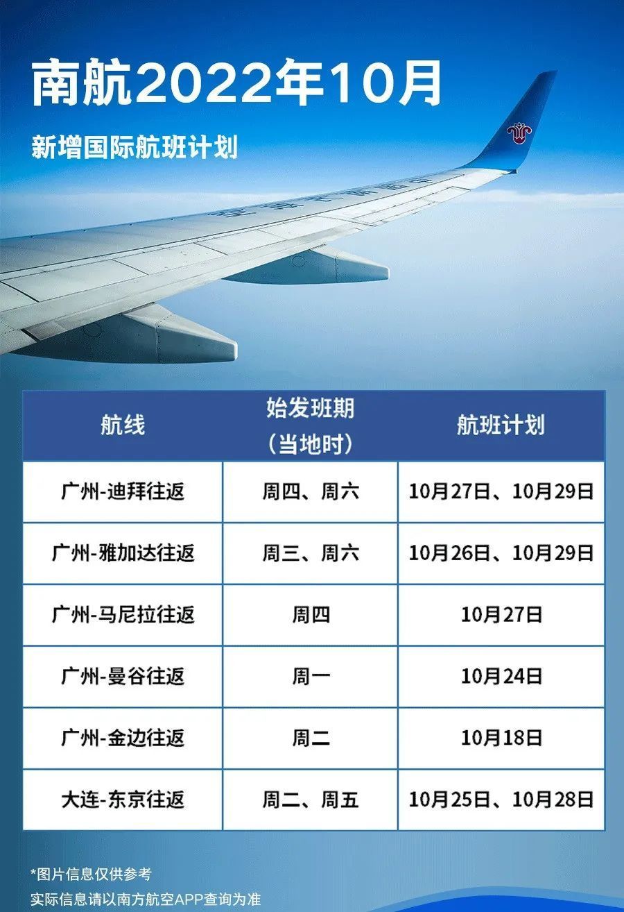 南航方面表示,计划 10 月起恢复广州-雅加达、大连-东京成田航线。同时,在广州—迪拜、广州—马尼拉、广州-曼谷、广州-金边等航线上增班。