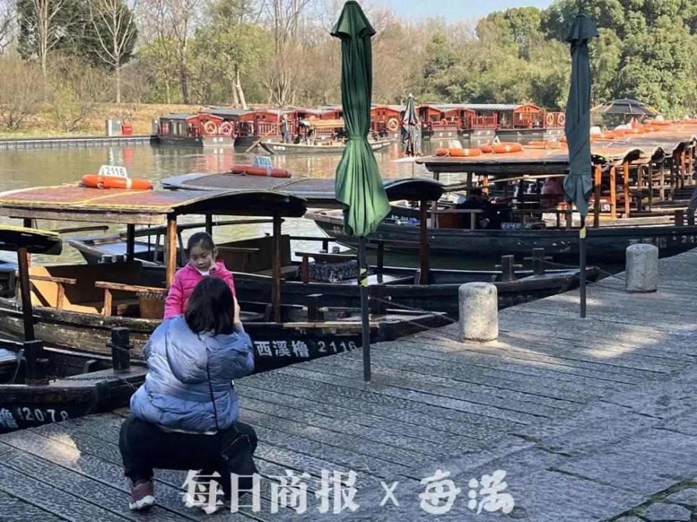 除了漫步在梅花林中,感受久违的阳光和闲适,今天记者看到,不少游客选择了乘船游西溪。西溪湿地“一曲溪流一曲烟”的生态环境特色,让乘坐电瓶游船或摇橹船的游客,可以细细品味“曲水寻梅”的西溪雅趣。