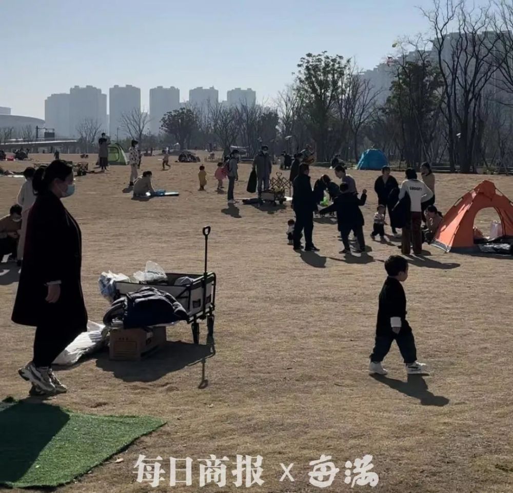 向公园内部走了数分钟,人流量明显多了起来。大部分游客是三口之家或是四口之家。记者看到,开阔的草坪上搭建着数十片帐篷,孩子们在一旁嬉笑玩闹,大人则坐在野餐车旁闲聊。还有不少家庭仅仅只带了一张野餐垫,就开始享受起美好的冬日阳光。