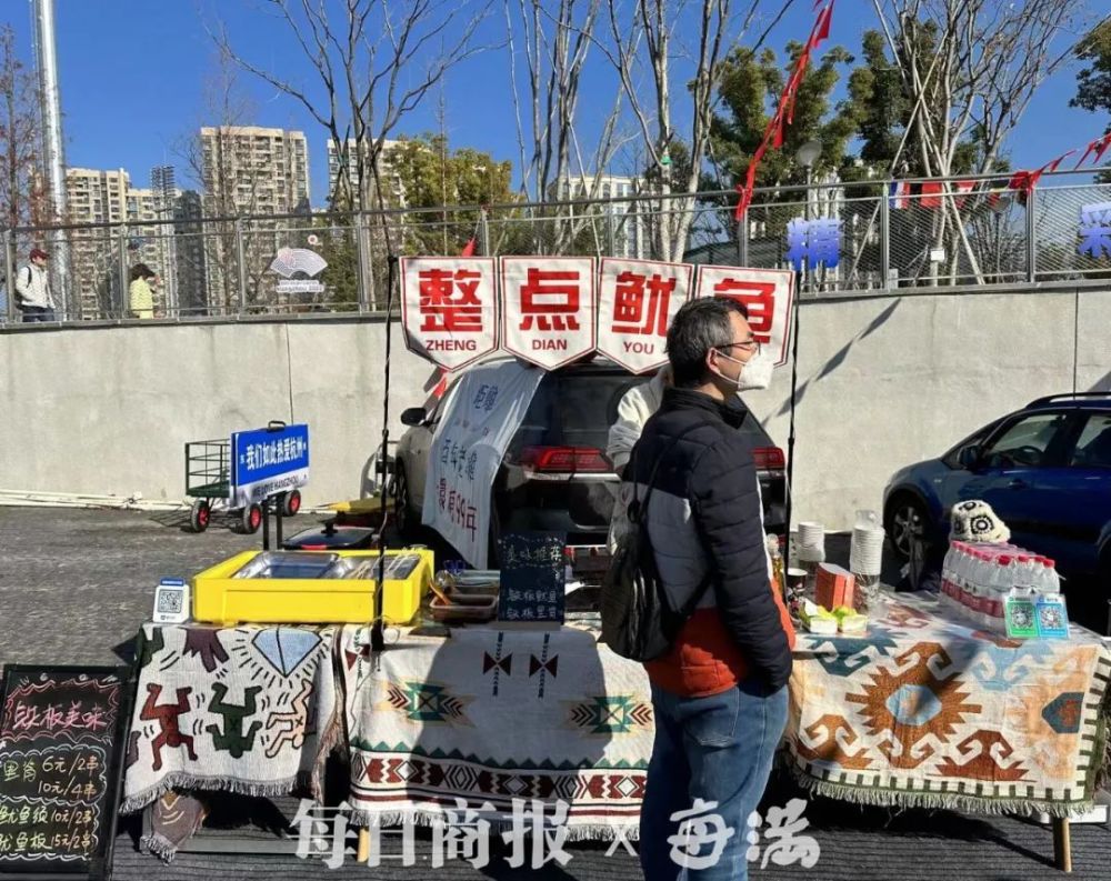 而在一旁的花令十二坊时尚街区,各色各样的美食与手工艺品更是吸引了不少人的目光。与一般的店铺不同,这里的店铺大多是“后备箱小店”,店主们开着自己的车,整出各色各样的绝活。在一家铁板鱿鱼店前,有人被“整点鱿鱼”这四字店名所吸引。而在一旁,还放着一块“我们如此热爱杭州”的路牌,不少人正在这里打卡留念。