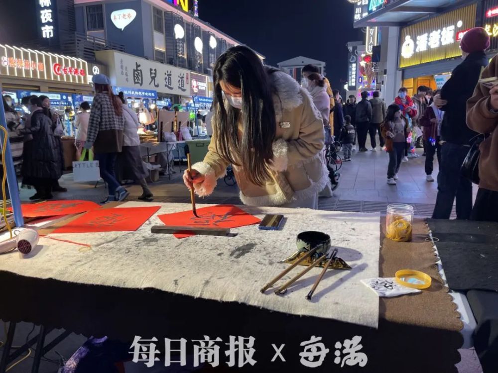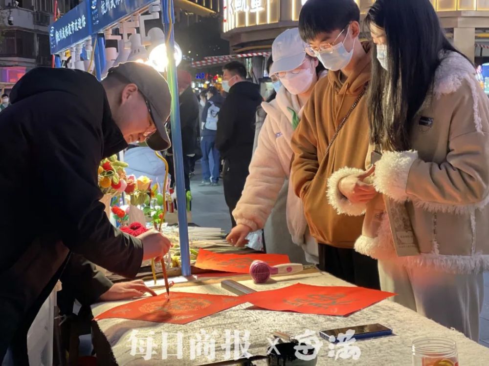 武林夜市的自助写福字摊位也是人气十足。摊位上为大家准备了毛笔和专门写福字的红纸,不少年轻人写完福字后还会带走。现场工作人员告诉记者,自助写福字的活动已经开始两三天了,每天都要写掉百来张红纸。