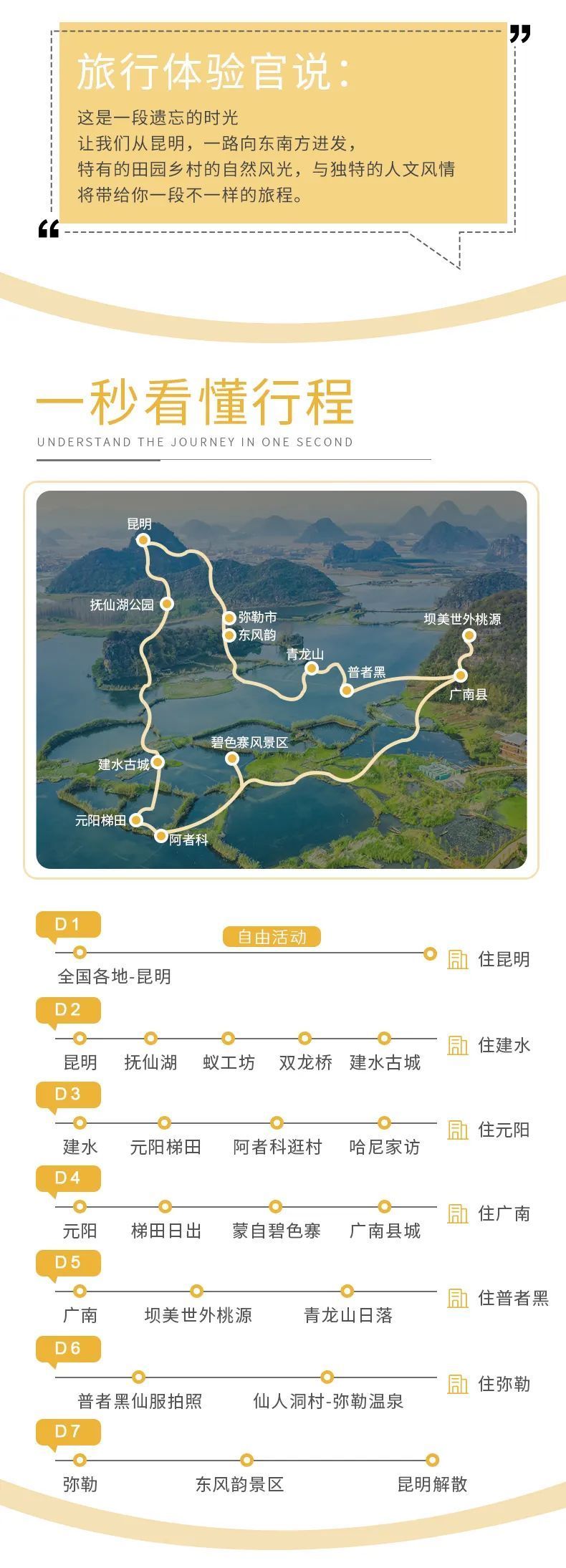 4.门票:元阳梯田景区门票、哈尼家访费用、阿者科村门票、碧色寨车票、坝美世外桃源景区门票+环保车+船票、弥勒东风韵门票
