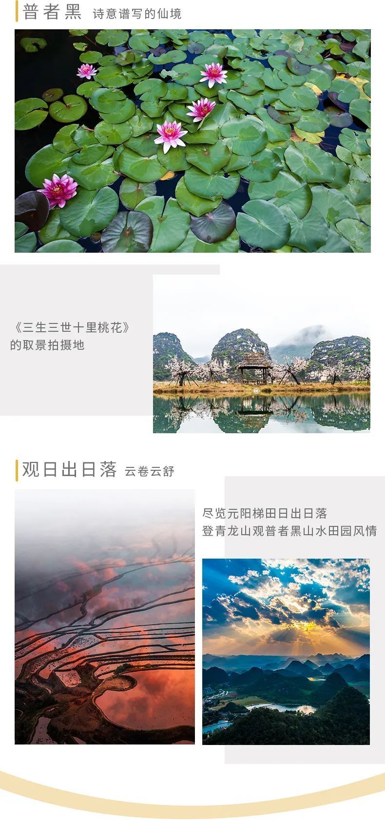 09:00?酒店用早后出发,首先抵达热播剧《三生三世十里桃花》的实景拍摄地【菜花箐村】看最美的‘小桂林’景致,三生缘起,静待花期;灼灼桃夭、十里芳华。小桥,孤峰,桃花岛…在湖水的倒映下美得特别不真实,恍若人间仙境,置身其中仿佛人在画中游。在这里可以穿上我们为大家准备的仙服拍上一组仙气十足的大片~