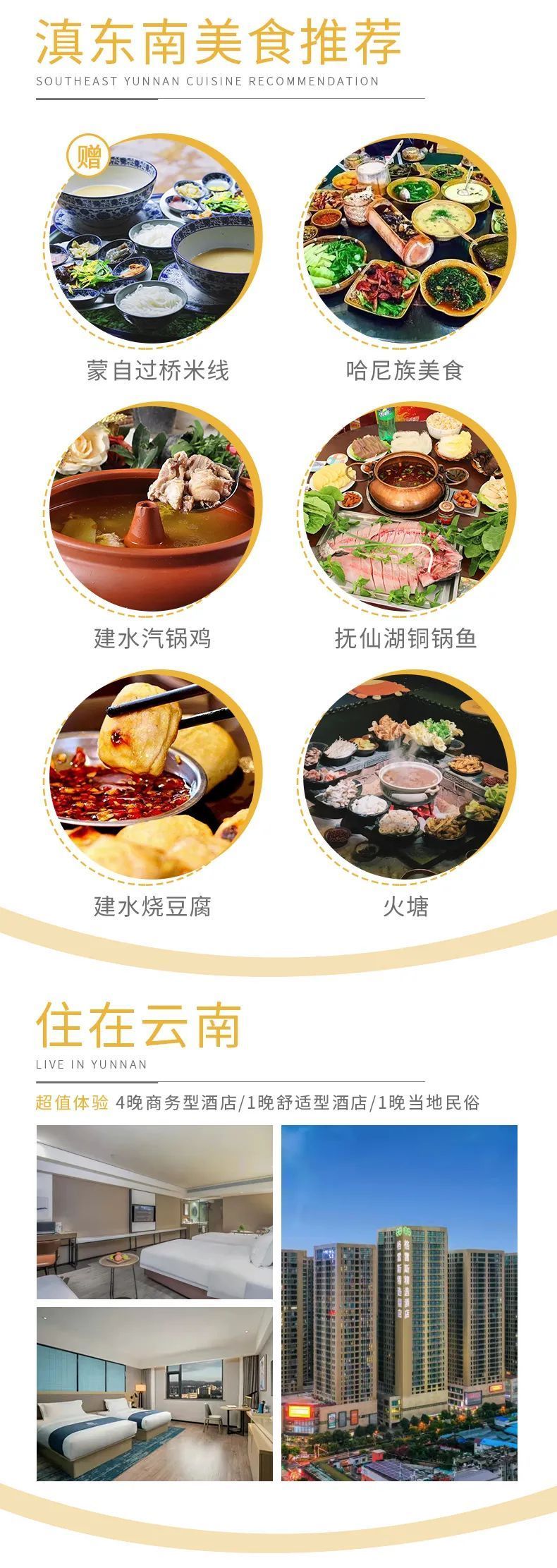 1.住宿:昆明商务型酒店标间1晚、建水商务型酒店标间1晚、元阳商务型酒店标间1晚、广南舒适型酒店标间1晚、普者黑当地民宿标间1晚、弥勒商务型酒店标间1晚(舒适型按当地三星酒店建造,商务型按当地四星酒店建造,旅游景区经济较为落后,酒店和南方城市酒店无法相比,敬请谅解)