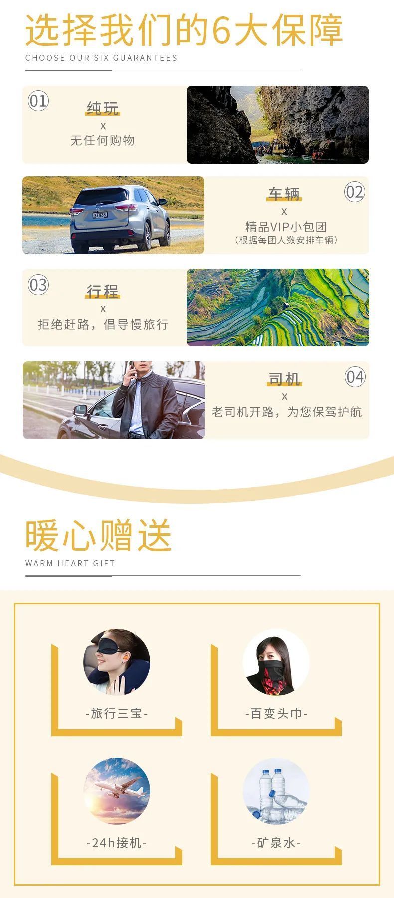 6.保险:每人赠送50万元保额旅行社责任险、34万元旅游意外险
