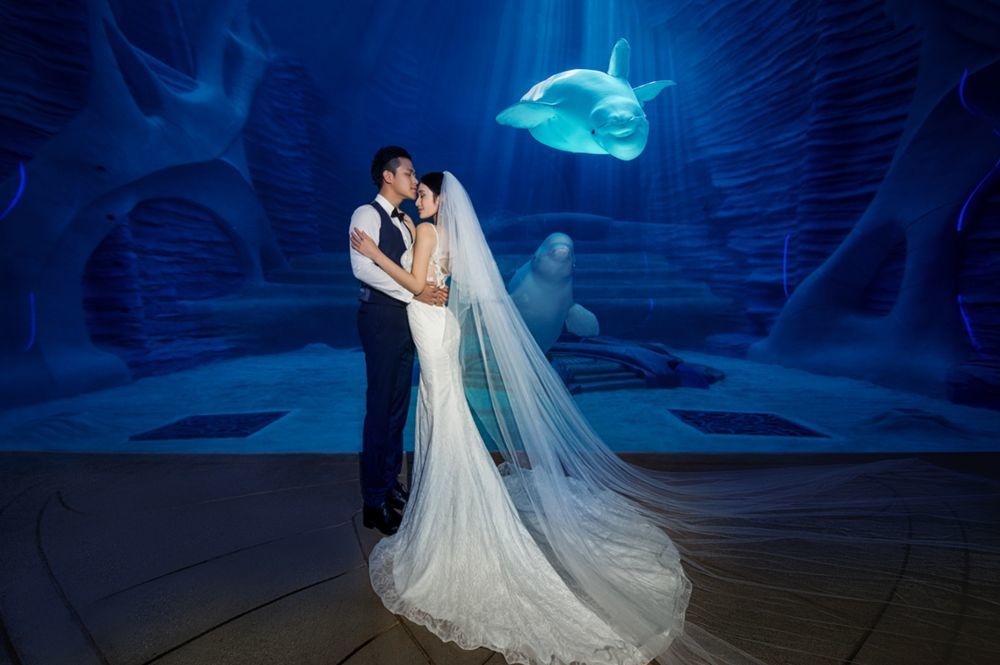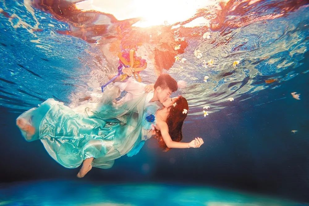 被誉为中国马尔代夫的蜈支洲岛,有保护最完好的生态珊瑚礁,海底世界五彩斑斓,选择这里拍摄一组唯美水下婚纱照是不是时尚又拉风呢?清澈湛蓝的海水散发着梦幻般的色彩,美丽的鱼儿在湛蓝的海水中欢快地游着,这样的场景真让人沉醉不已,在如梦似幻的海底盟誓今生,让大海见证自己一生一世的爱情,在海底深深一吻,来一场人鱼公主与王子的美丽邂逅吧。