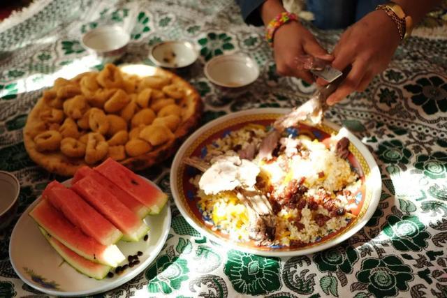 抓饭是新疆各族人民最喜爱的食物,从味道上分有甜咸两种。馕坑烤肉中烤熟的烤肉油亮生辉,香气扑鼻。新疆第一盘的大盘鸡,量大,吃到爽。