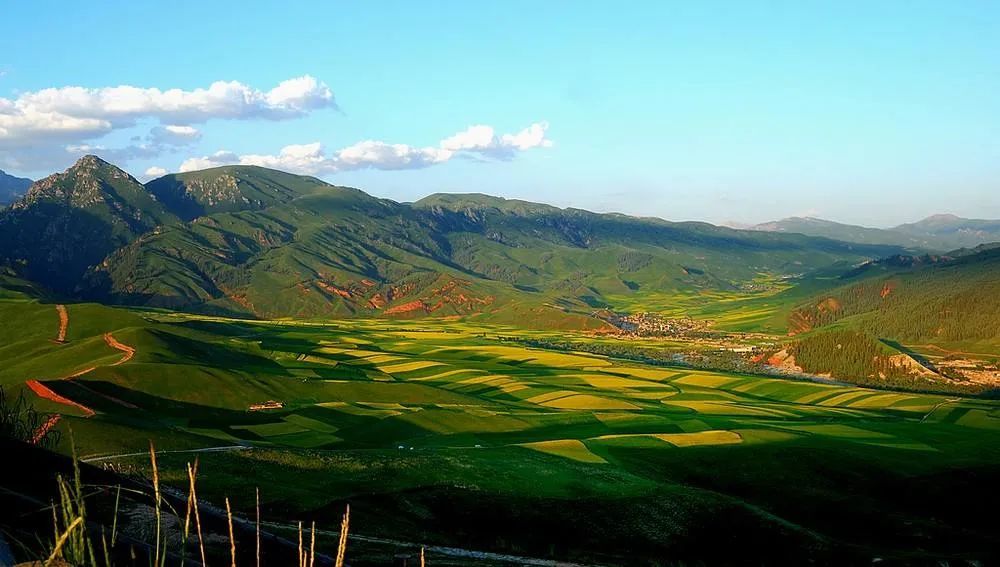 祁连与蓝天白云,仙境美景勾勒出一幅大气的天然油画。卓尔山是祁连山的一条山脉,有着草原风光、丹霞风貌。卓尔山山顶绿茵葱茏,山四周是绵延不绝的祁连山脉,每年6月至8月时的草原翠绿欲滴,金灿灿的油菜花雄浑壮阔。