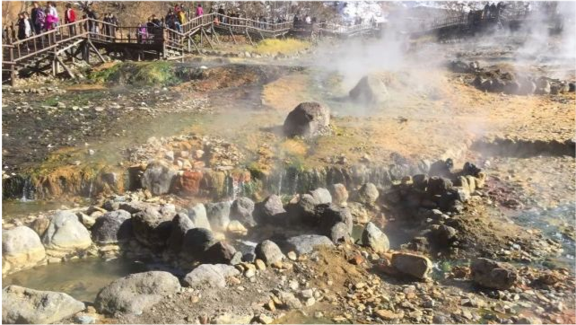 天池到温泉广场大约不到半小时的车程,下车后步行五分钟到达温泉广场,也就是聚龙泉所在地,有温泉可以感受一下,周围有卖吃的,可以买几个温泉鸡蛋,10元3个,蛮好吃的。