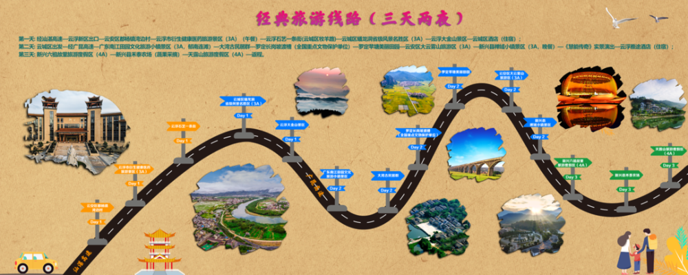 第一天: 经汕湛高速—云浮新区出口—云安区都杨镇湾边村—云浮市衍生健康医药旅游景区(3A)(午餐)—云浮石艺一条街(云城区牧羊路)—云城区蟠龙洞省级风景名胜区(3A)—云浮大金山景区—云城区酒店(住宿);